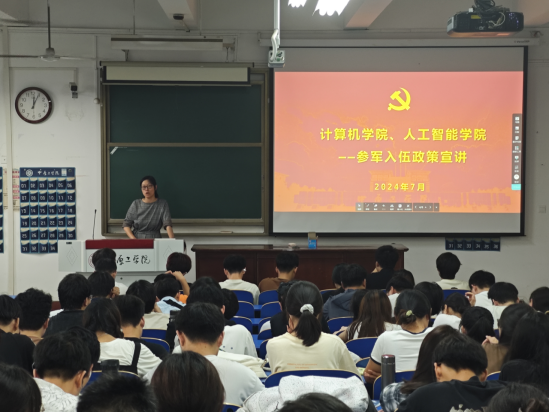 与计算机学院在龙湖校区3号教学楼235教室联合召开了2024年征兵宣讲会。学院党委副书记侯向花、各年级辅导员及各年级学生代表共200余人参加了此次宣讲会。会议由辅导员王腾老师主持。