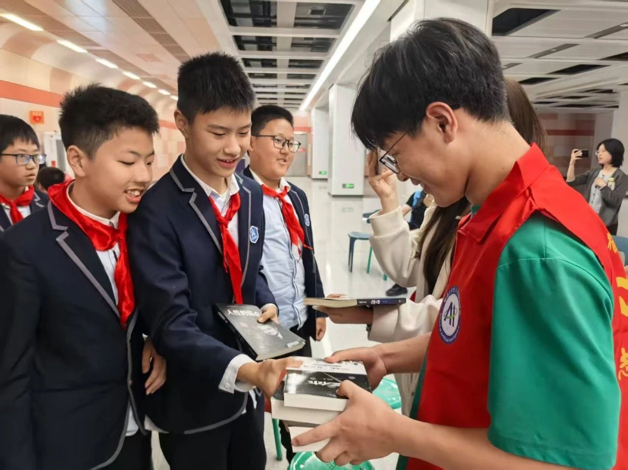 在“旧书新知 以书会友”环节,参与活动的学生与主持人热情互动。大家纷纷拿出自己日常阅读的书籍相互赠送,并认真书写心得便签张贴在封皮上。在交换书籍的过程中,偷拍