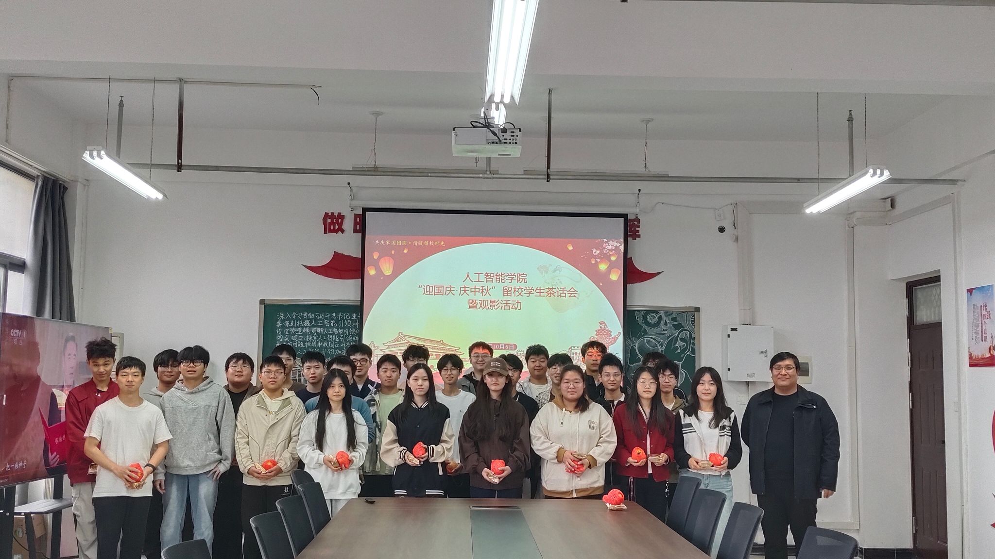 在三号组团楼A915会议室隆重举办“迎国庆・庆中秋”留校学生茶话会暨观影活动,学院直属党支部副书记张志鹏与假期留校学生代表齐聚一堂,共度佳节。