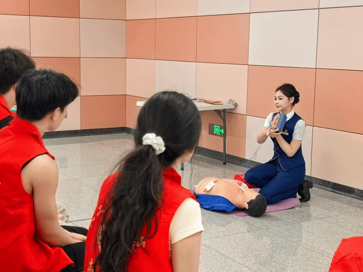 学生及党员代表学习了排队候车引导技巧和AED应急救护知识。党员代表现场演示了AED的使用流程,普及了急救技能,展现了党员服务群众、守护生命的责任担当。