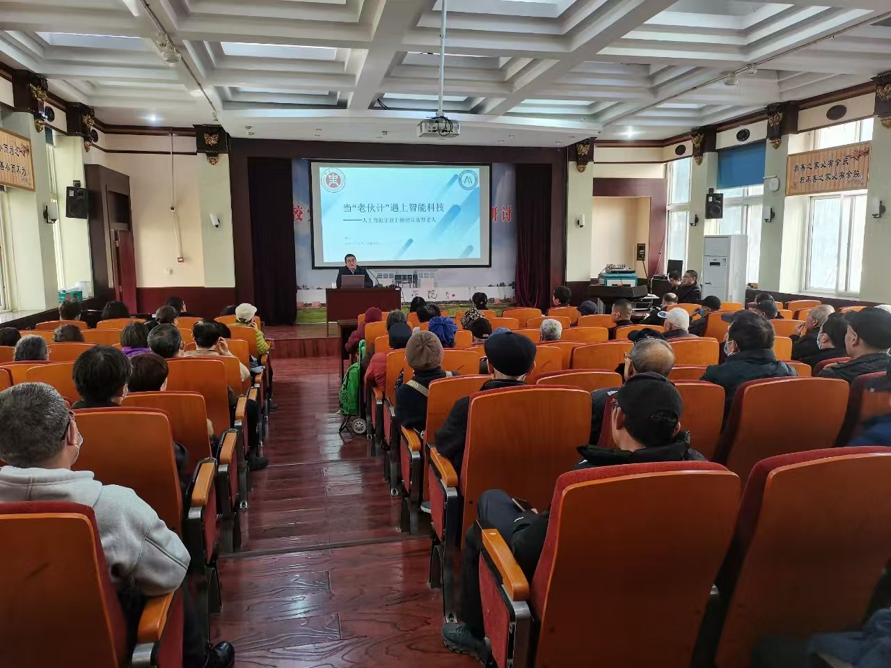 副院长杨关博士受邀为大家做“AI+养老”专题辅导,在郑近百位退休老党员参加并认真聆听了报告。