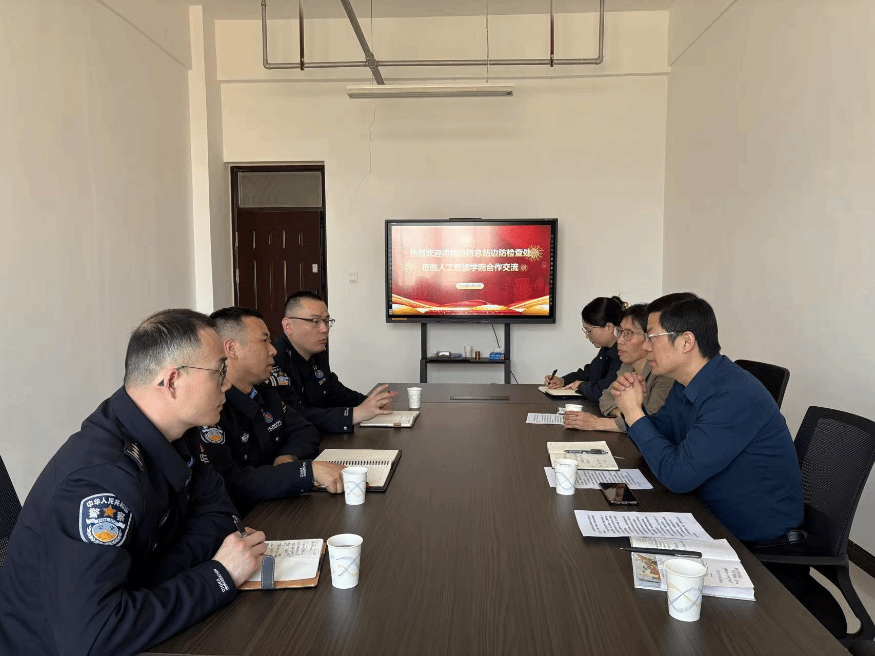 在人工智能领域的技术积累和科研实力,并结合边检实际需求,探讨了学院相关技术在提升边检工作智能化水平方面的应用潜力与前景。双方围绕AI赋能边检业务的具体路径、技术难点及未来合作方向进行了热烈讨论。此次交流不仅增进了双方了解,更为偷拍